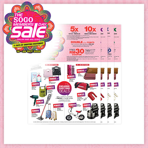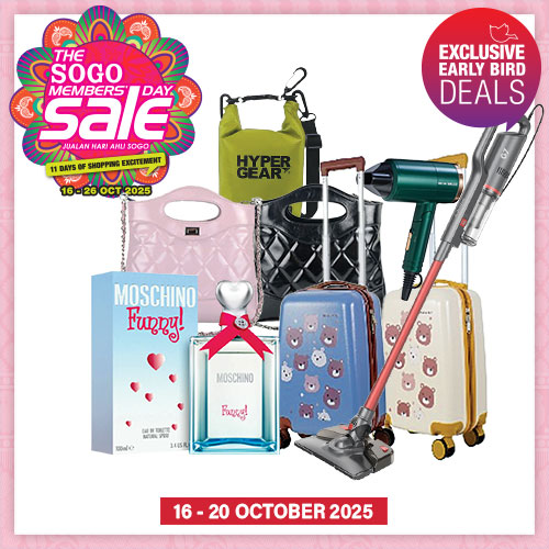 View allDiscover the best deals from our exciting events like ‘Thrilling Tuesday,’ ‘Terrific Thursday,' ‘Double Digits Days,’ and 'Pay Day Specials' as well as during public holidays and other special occasions. Indulge in luxury fragrances, fashion, and lifestyle products. Follow us at @sogomalaysia, and don’t forget to scan the QR codes to stay connected.