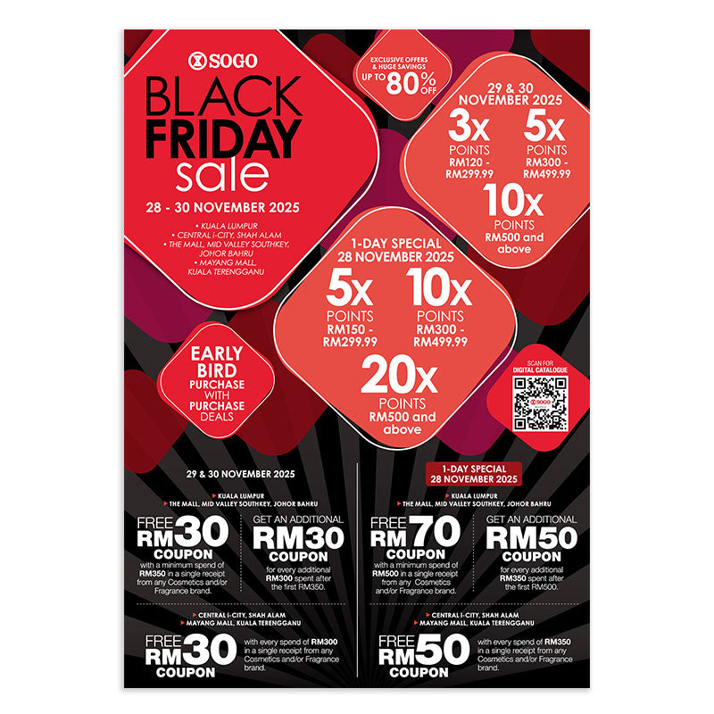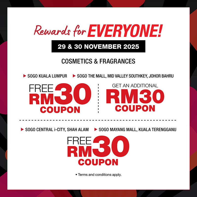 FREE RM30 Coupon with a minimum spend of RM350 (KL & JB) or RM300 (SA & KT) in a single receipt from any cosmetics and/or fragrance brand. Get an additional RM30 Coupon for every additional RM300 (KL & JB) spent after the first RM350.