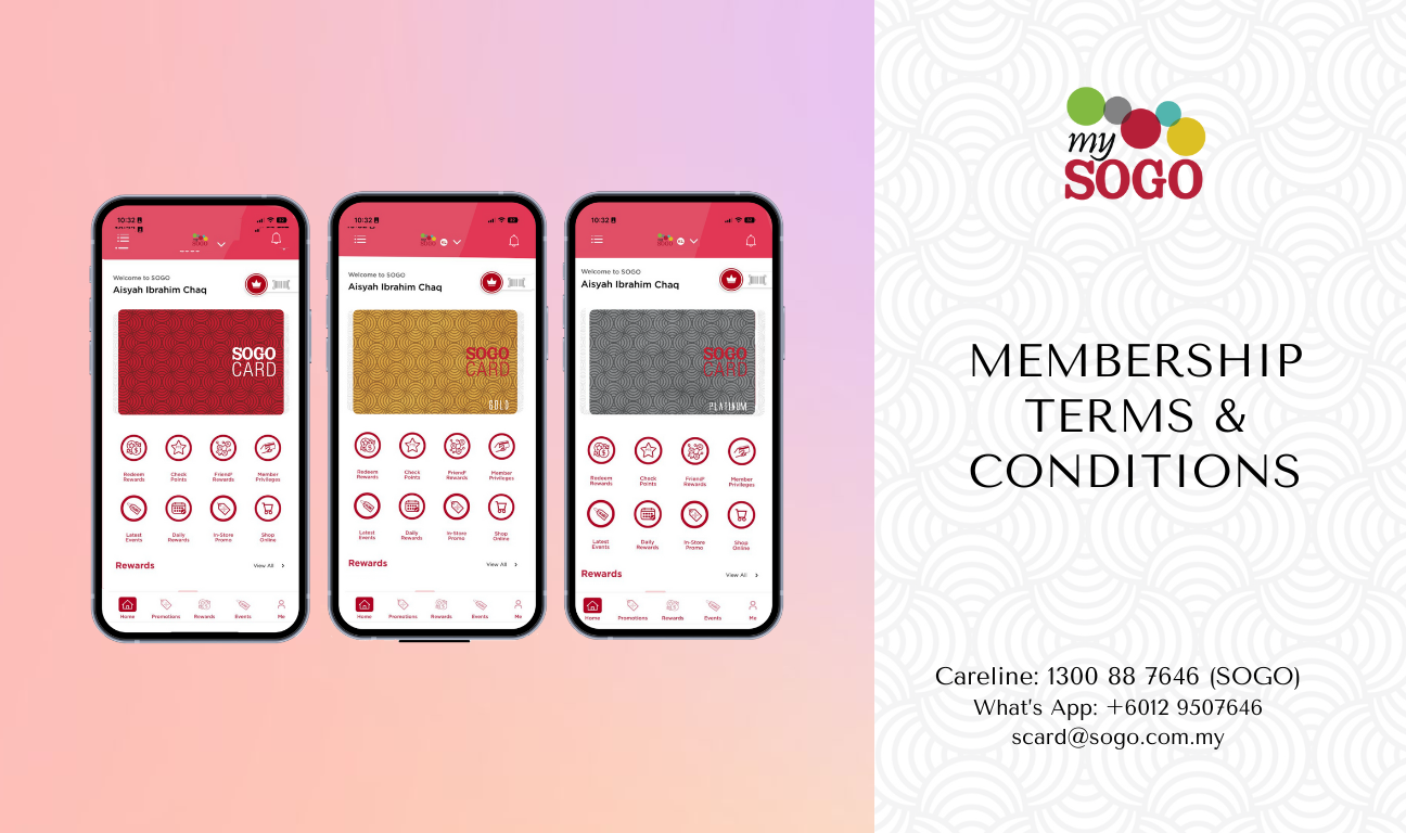 These Terms and Conditions govern the SOGO Membership and Rewards Loyalty Program operated by SOGO (K.L.) Department Store Sdn. Bhd. The program allows cardholders to earn SOGO Reward Points on selected SOGO purchases at all SOGO outlets in Malaysia and receive additional membership benefits outlined in the Terms and Conditions of the program (the ‘Program’).